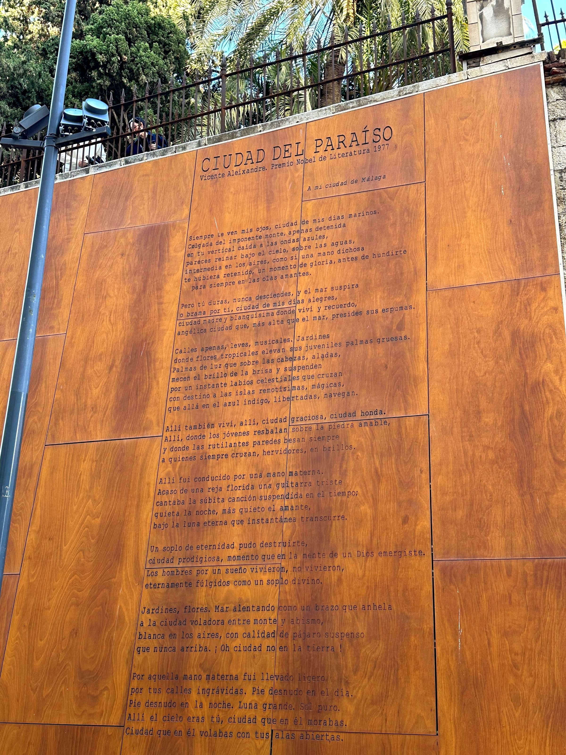 I was walking along Paseo de la Alcazabilla when something made me slow down. Not a street performer, not even the Alcazaba itself, but words carved into the wall, held inside a large wooden and metal structure that felt impossible to ignore. It read “Ciudad del Paraíso,” city of paradise. Beneath it, verses from a poem.